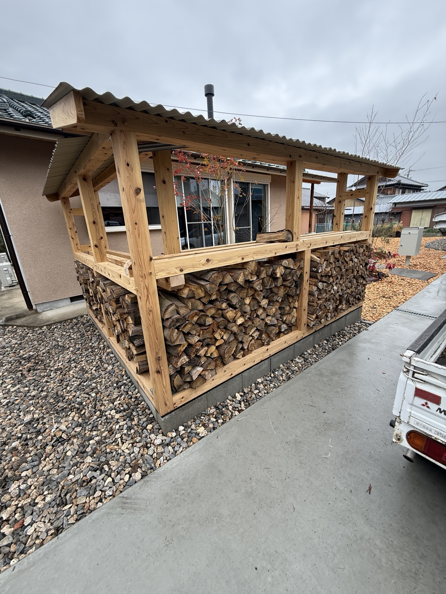 本日は、庭真ガーデンハウス様の紹介で、薪ストーブユーザー様のお家に薪の配達へ軽トラ2車で行ってきました。 軽トラ1車は網かご1.5カゴになります。積載前 積載後、残り網かご0.5杯です。 素敵な薪棚ですね。 流石!庭真さ […]